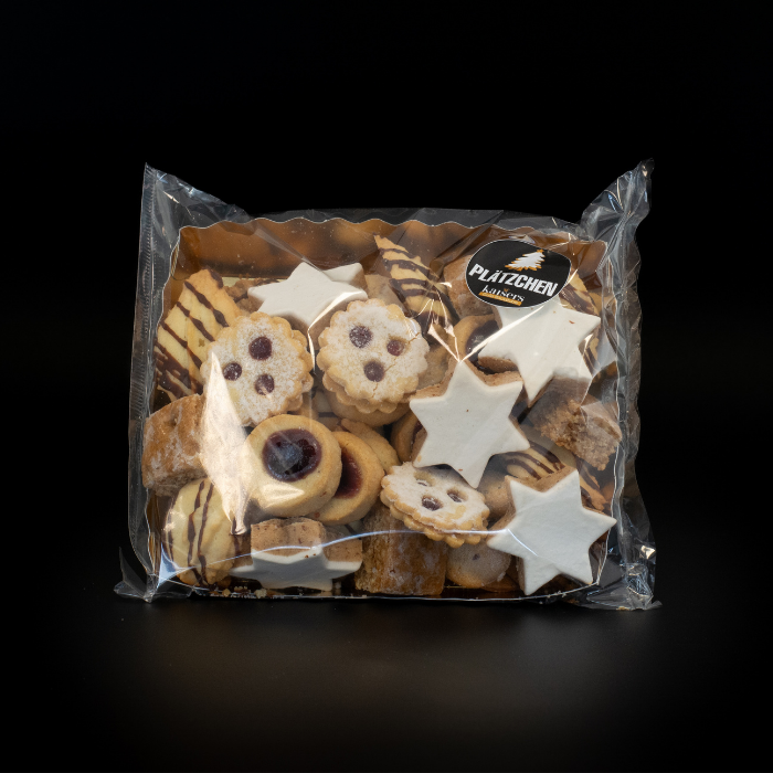 Inhalt: Basler Leckerli, Zimtsterne, Vanillegipferl, Husarenkrapfen, Choco-Nussplätzchen, Springerle und Butterplätzchen